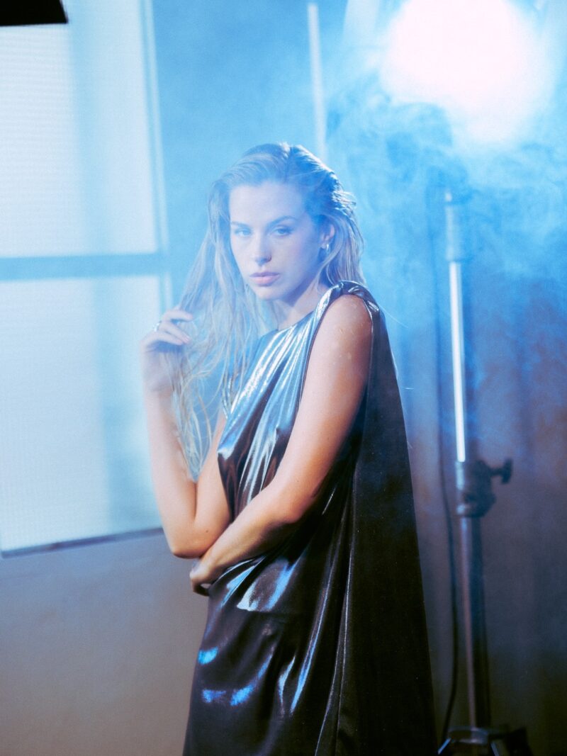 VESTIDO GLITTER CON ESPALDA DESCUBIERTA Y FRUNCE EN LA COLA