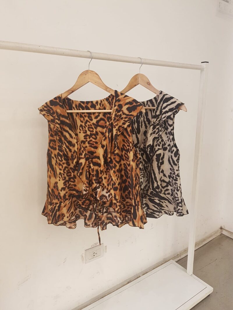 BLUSA CON VOLADOS Y 2 TIRITAS DE CEY EFECTO ARRUGADO PRINT, PODES ARMAR TU OUTFIT CON EL SHORT ART 2903