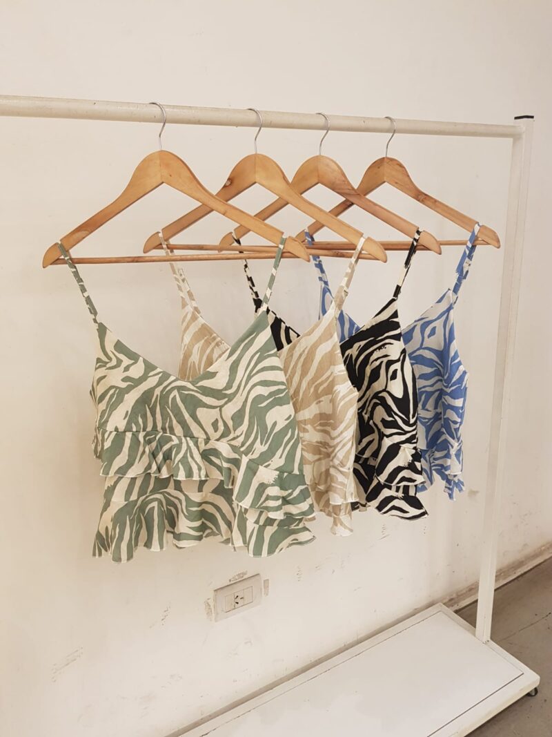MUSCULOSA CON VOLADOS DE CEY EFECTO ARRUGADO ESTAMPADO , PODES ARMAR TU OUTFIT CON EL SHORT ART 2904