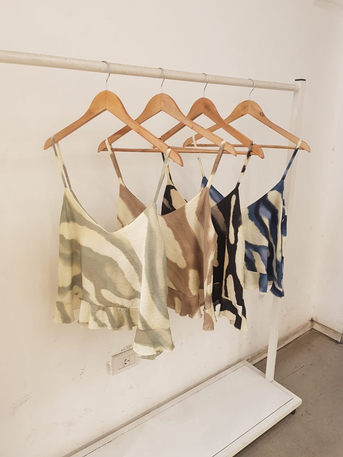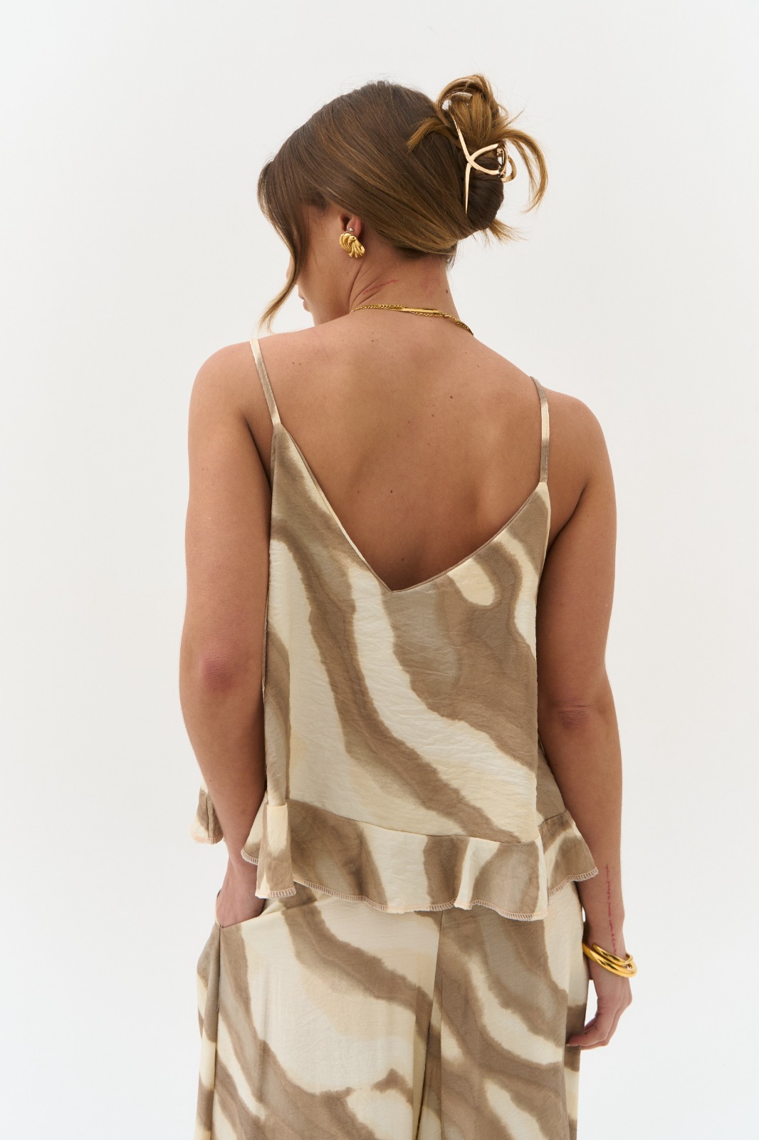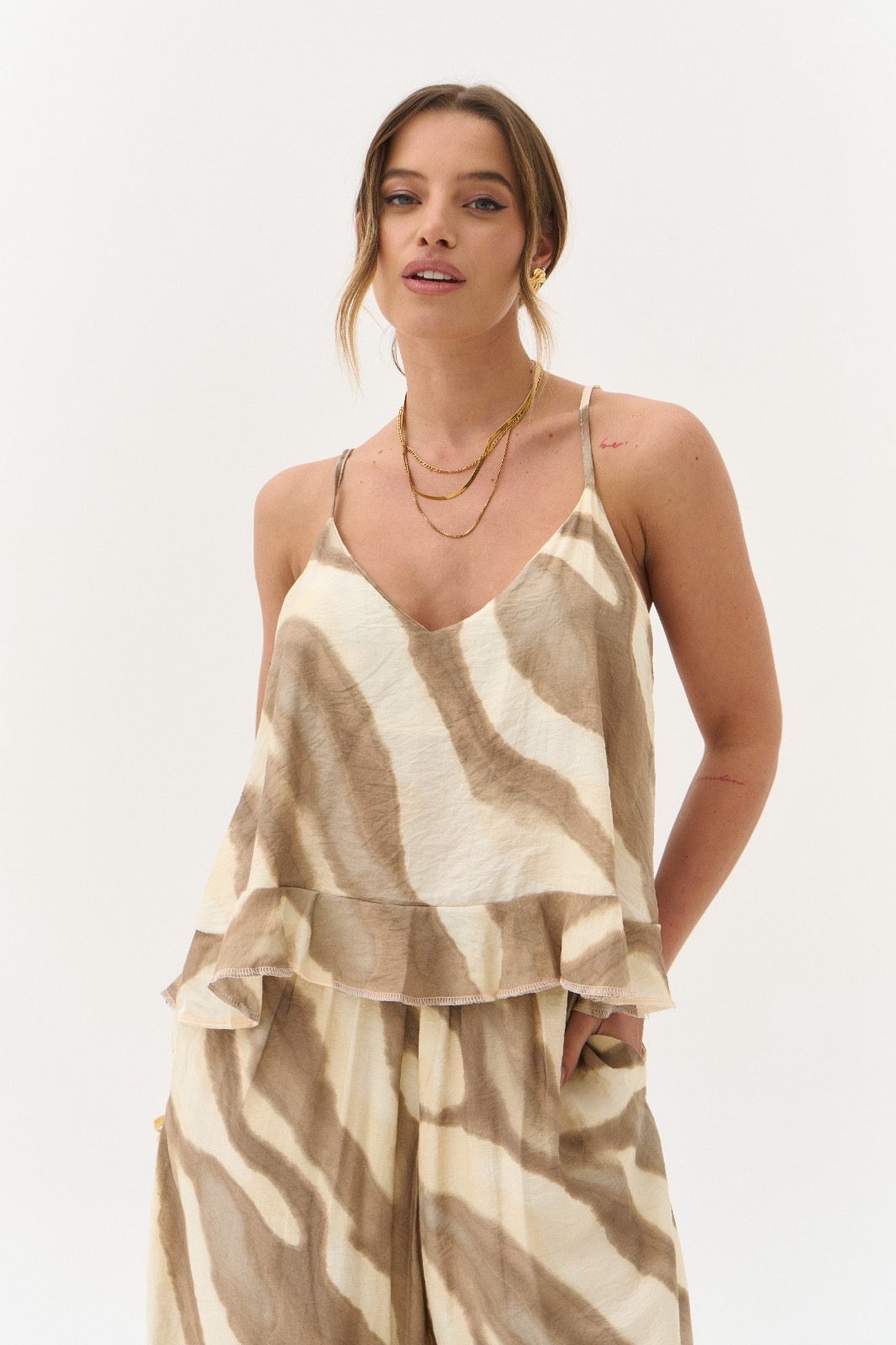 MUSCULOSA DE CEY EFECTO ARRUGADO ESTAMPADO CON VOLADO ABAJO, PODES ARMAR TU OUTFIT CON EL SHORT ART 2903