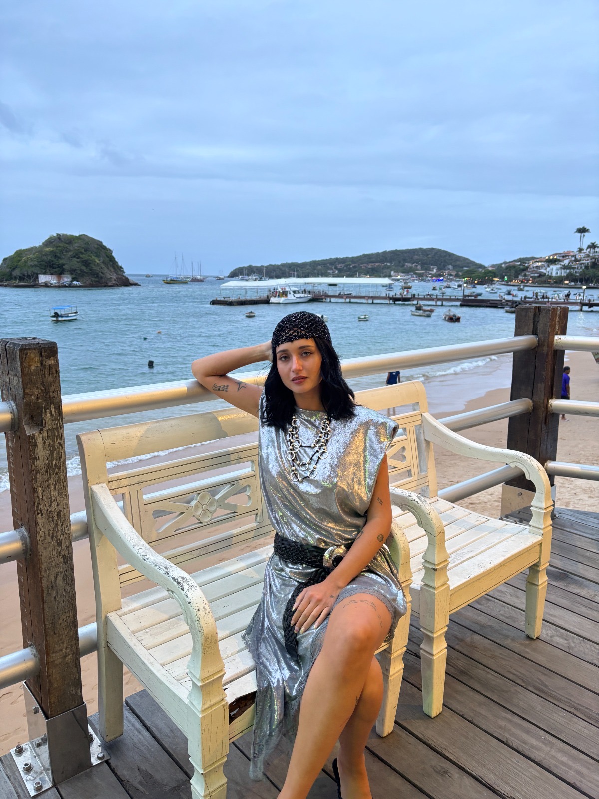 VESTIDO DE LENTEJUELA CRUZADO CON FUNCES Y MANGA LARGA CON ABERTURAS